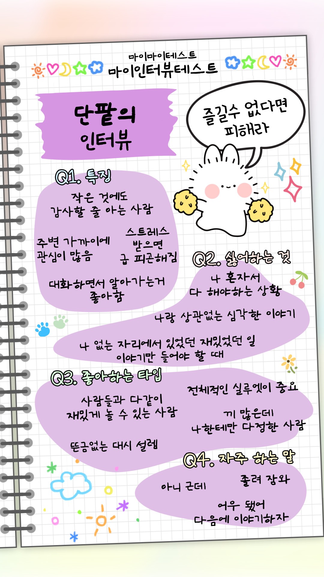 MyMyTest가 새로운 MyInterview 테스트와 함께 나왔기 때문에 한번 시도해 보았습니다. 특징, 싫어하는 것, 좋아하는 유형, 자주 하는 말을 말하는 것 같았습니다.