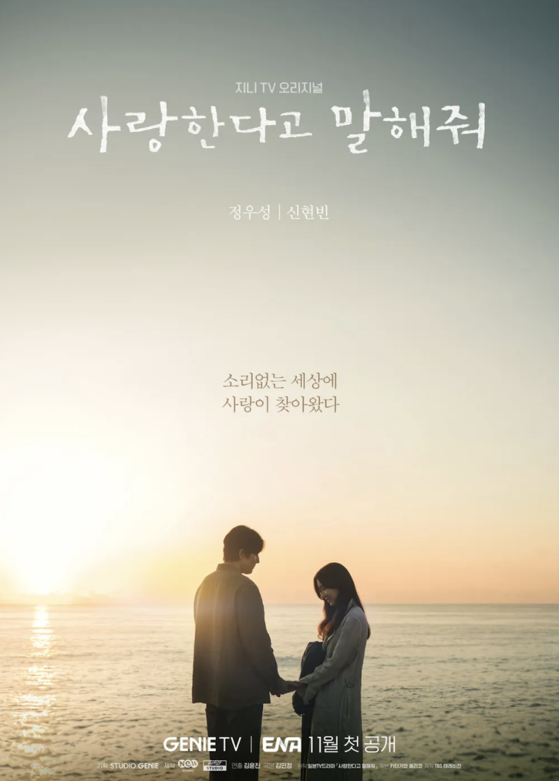 사랑한다 말해주세요 기본정보ENA 2023년 11월 방송 예정 감정을 말이 아닌 그림으로 표현하는 데 익숙한 청각장애인 차진우와 정모은의 운명적인 이야기를 그리는 힐링 멜로드라마. 자신의 감정을 목소리로 표현 출연 : 정우성, 신현빈 출연 : 미정 연출 : 김윤진 각본 : 김민정(구르미 그린 달빛, 안나라스마나라 등) 스트리밍 ott : 지니TV