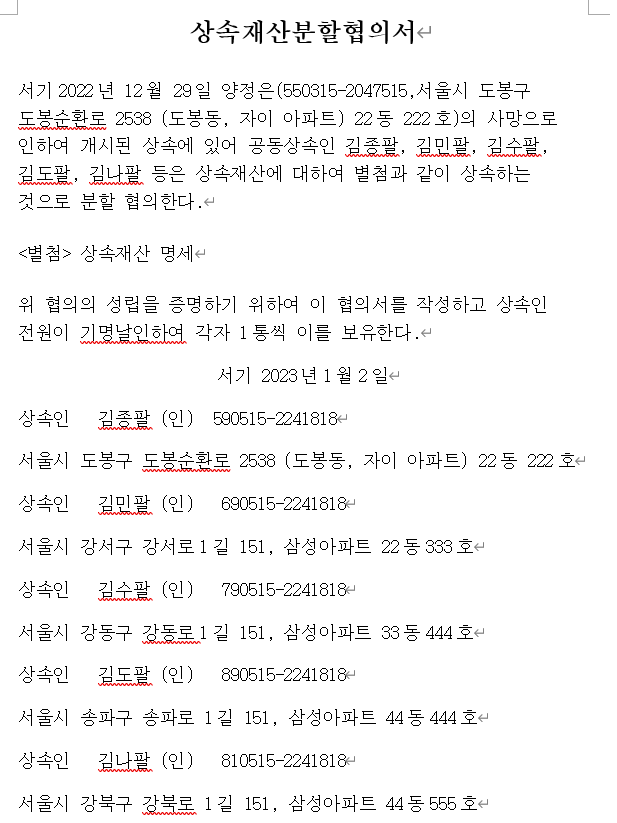 3. 상속분할 협상은 어떻게 합니까?이것은 매우 어려운 문제입니다. 매매계약서는 승계등기를 수탁한 법무법인에서 매매신고 완료한 지방사무소나 시·군·구청에서 인터넷이나 인터넷으로 쉽게 받을 수 있다. 상속인 간에 직접 협상이 있어야 합니다. 그러나 상속인 중 일부가 동의하지 않는 경우에는 어떻습니까?이 경우에도 앞서 언급한 법정지분 상속등기는 가능합니다. 일부 상속인이 협조하지 않아도 가능하지만 협상이 우선입니다.
