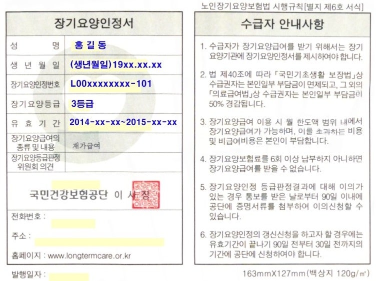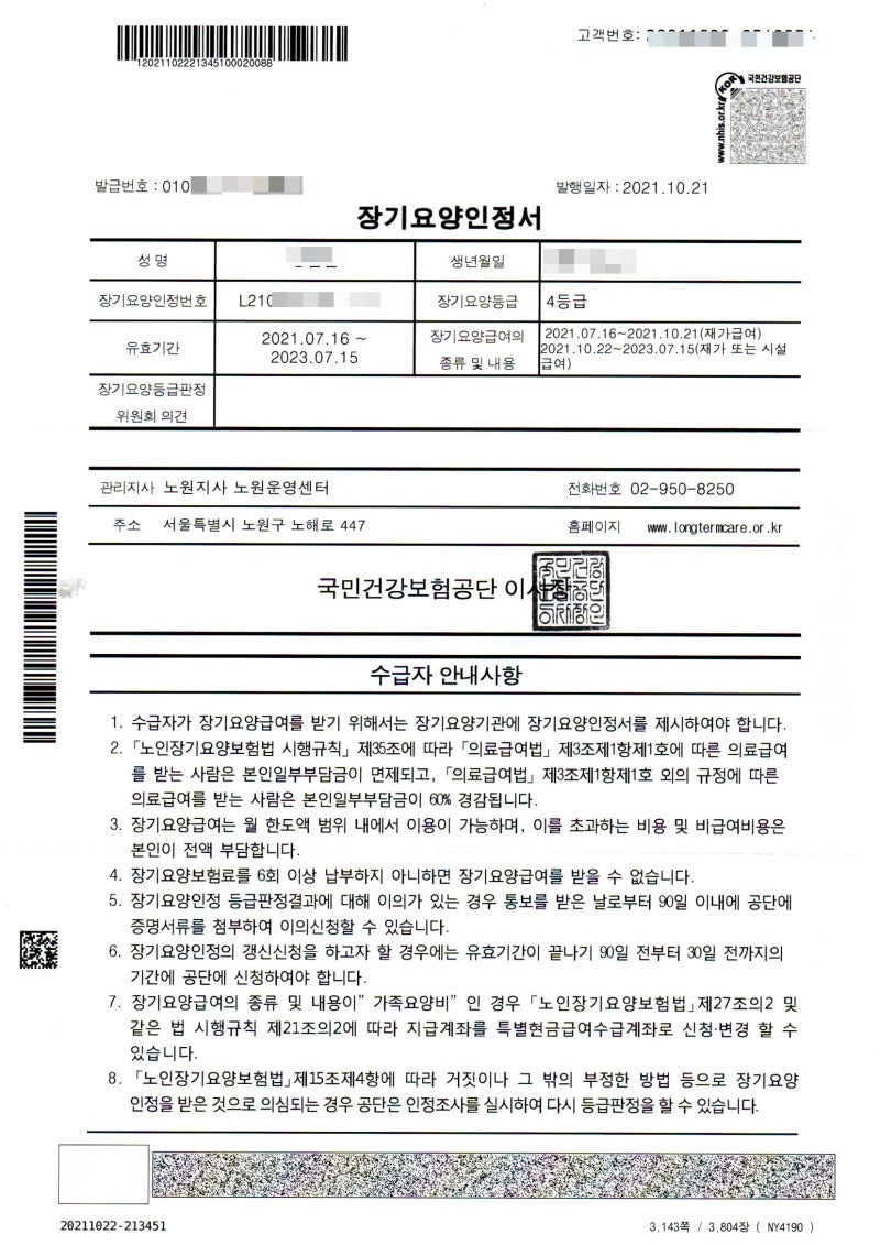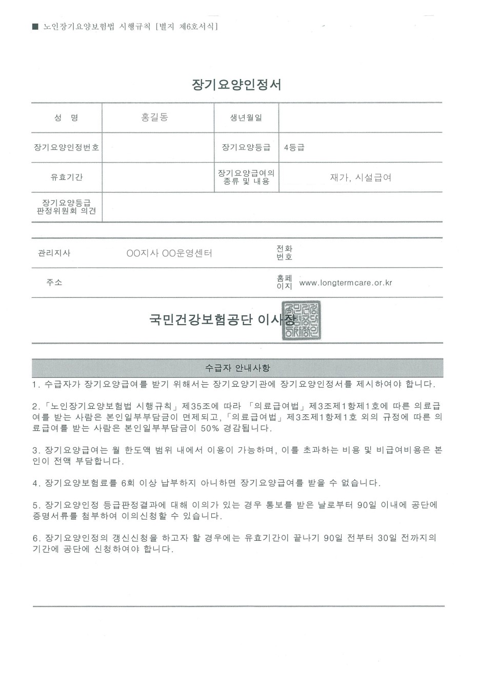 “노인장기요양보험 혜택을 누리려면 장기요양증이 필요합니다.” 건강보험사에 신청하고 회사 직원의 방문과 내부심사를 거쳐 장기요양증을 발급받을 수 있다. 신청부터 발급까지 약 1개월 정도 소요되며, 심사 후 아래와 같은 인증서를 수령하게 됩니다.