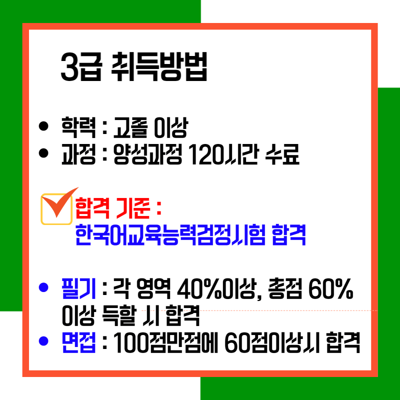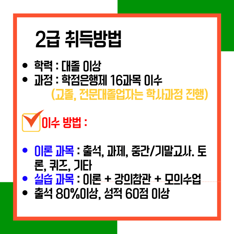 https://mblogthumb-phinf.pstatic.net/MjAxOTA4MDVfMTUz/MDAxNTY0OTkzNjg3MTky.s1_4sQhT1a_nMYyNKOwmWwYTMdAz9QODxg9LKQSuZxkg.z7szNZF_2yHoiZB1qHk-rj8OXff72sMW2JZTZ-MHRBY g.PNG.no1bean/%EB%B8%94%EB%A1%9C%EA%B7%B8_%ED%91 %9C%EC%A7%80.png?type=w800 한국어교사 자격증의 특징은 문화체육관광부가 발급하고 국립국어원이 주관하는 것으로 전임교원 자격증(국립국어원에서 발급)과는 별도의 자격이다. 교육부) 한국어를 가르치는 기관이다. 자격기준은 지원자의 직급 및 학위소지자, 훈련과정 수료자, 경력요건 보유자를 기준으로 적용됩니다. 국가시험은 없으며, 해당 교육과정을 이수하면 자격증이 발급됩니다. 자격요건은 다음과 같다. 2급 한국어 교사는 외국어로서의 한국어 교육 분야를 대학에 입학하여 전공 또는 복수전공으로 졸업하거나, 학점은행제도를 이용하여 각 분야에서 필수학점을 이수하고 이수하여야 한다. 외국어로서의 한국어 학위. 학위(타 전공 포함)를 취득한 경우 자격시험을 통해 취득할 수 있습니다. 3급 한국어 교사는 외국어로서의 한국어 교육 분야를 부전공으로 대학을 졸업하고 각 분야별 필수학점을 이수하거나 국립국어원에 등록된 연수과정을 이수하고 필기과목과 필기시험을 모두 합격한 자 한국어 교육능력 면접시험 및 자격심사를 신청합니다. 자격 레벨 업그레이드 요건을 통해 획득할 수 있습니다. 1급은 업그레이드를 통해서만 취득 가능하며, 2급 한국어 교사 취득 후 5년 이상의 교직 경력과 2,000시간 이상의 교직 경력이 필요합니다. 2단계는 훈련과정이다. 대학에서 부전공으로 취득한 경우에는 최소 3년의 교직 경력과 2,000시간 이상의 교직 경력이 필요합니다. 대학에서 부전공으로 취득한 경우에는 최소 3년의 교직 경력과 1,200시간 이상의 교직 경력이 필요합니다. 신용은행제도란 무엇인가요? 학점은행제도는 교육부 산하 국립평생교육진흥원이 관리하는 제도이다. 고등학교 졸업자 또는 이와 동등한 학력을 가진 사람이라면 누구나 자유롭게 사용할 수 있습니다. 학점을 쌓아 일정 조건을 충족하면 학위, 자격증, 국가고시 응시자격을 취득할 수 있습니다. 이룰 수 있는 평생교육제도이다. 학점은행제 취득방법 : 학력별 학점은행제 비전공자의 한국어교사 자격증 2급 취득방법은 최종학력에 따라 준비요건이 다르며, 기본요건으로는 대학학위(4~4학위)가 필요하다. 16학점(48학점)을 이수해야 하며, 16학점의 전공과목을 이수해야 합니다. 그래야 합니다. 그 중 하나의 과목이 실무과목이다. 대학 졸업자는 3학기로 나누어 16개 전공과목을 이수할 수 있습니다. 3학기가 걸리는 이유는 학기당 24학점, 연간 42학점만 허용하는 연간 학점한도 규정 때문이다. 매년 2학기에 시작하면 한 학기에 8과목씩 수강하면 두 학기 안에 끝낼 수 있기 때문에 잘 활용하면 최단 시간에 취득할 수 있습니다. 전문대학 졸업자, 고등학교 졸업자는 학력요건이 부족하여 학점은행제도를 통해 대학자격을 취득할 수 있습니다. 단, 이수해야 하는 과목은 자격증 전공의 16과목에 추가되어야 합니다. 고졸자는 보통 7학기 정도 소요되기 때문에 3급 시험을 준비하는 경우도 있지만, 최종적으로는 승진기간과 학사학위 취득 능력도 허용되기 때문에 2급을 취득하는 것이 유리하다. 학점은행제 수강방법 학점은행제 한국어교사자격 2급 수강신청 방법은 이론수업방식과 실습방식으로 구분된다. 이론수업 방식은 실습을 제외한 모든 과목이 온라인으로 진행되기 때문에 편안하고 쉬운 학습 환경을 제공합니다. 수료조건은 출석률 80% 이상, 성적 60점 이상이어야 합니다. 해당 기간 내 매주 온라인 강의를 수강하면 출석으로 인정됩니다. 과제, 퀴즈, 토론, 출석, 정기고사(중간/기말) 등의 평가를 바탕으로 점수가 부여됩니다. 생각보다 수료율이 훨씬 높기 때문에 강의를 잘 듣고 모든 평가 요소에 참여한다면 수료에 큰 어려움은 없을 것입니다. 다만, 출석률이 낮거나 점수가 낮아 낙제한 경우 해당 과목을 다시 수강해야 하므로 열심히 공부해야 한다는 점을 기억해야 합니다. 실습교육은 이론강의 + 관찰수업 + 모의수업으로 구성되며, 출석수업은 약 9회입니다. 다만, 코로나19의 영향으로 출석수업은 Zoom을 활용한 실시간 원격수업으로 진행되고 있으나, 지침에 따라 변경될 수 있는 점 양해 부탁드립니다. 자세한 강좌 수강 방법이 궁금하시다면 제가 이전에 작성한 내용을 확인해보세요. 수강방법은 여기를 클릭하세요. < 한국어교사 2급 자격증 취득 비용 한국어교사 2급 자격증 취득비용은 준비 시 결정하는 중요한 요소입니다. 대상 가격이 상대적으로 낮거나 너무 높을 경우에는 신중하고 현명한 선택이 필요합니다. 비용은 이론과 실습으로 나누어집니다. 이론 적정가격은 과목당 3만원~4만원, 실습 적정가격은 40만원~50만원이다. *교과목이 개설된 교육원의 혜택 적용 여부에 따라 과목이 달라질 수 있으므로, 적절한 가격을 선택하여 수강하시는 것이 좋습니다. 마지막으로 비전공자가 2급 자격증을 취득하기 위해서는 학점은행제도를 활용하는 것이 적절한 방법이다. 대학에 등록하지 않고도 온라인으로 16개 전공과목을 이수하면 자격증을 취득할 수 있다. 또한, 실