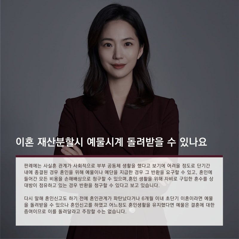 이혼재산분할, 이혼전문변호사에게 맡겨주세요. 개인정보 취급방침 및 마케팅 이용 동의서입니다. 가사, 이혼, 상속(한정후견 개시) “처음부터… 의뢰인은 모친 한정후견 개시를 원한다… 2022-08-19 가사·이혼·상속(이혼) “기분이 안 좋지만, … 의뢰인은 배우자의 불륜을 의심해 재판에서 이혼했다… 2022-04-21 가사, 이혼, 상속(이혼조정신청) “지금부터… 의뢰인이 배우자와 이혼한 후 위자료를 청구하려 하는데… 2022-03-29 가사, 이혼, 상속(상속제한승인) “불가능하다… 의뢰인이 한정상속승인 신청기한을 지났다… 2022-03-25 가사·이혼·상속(간음녀 소송…이현. co.kr 신혼부부 이혼사유가 있는지 확인해보세요! 이혼사유는 다양합니다. 민법 제 840 조에 따르면 법원에서는 이혼사유가 됩니다. 다음 중 하나에 해당하는 경우에는 가정법원에 이혼을 신청할 수 있는 경우 1. 배우자가 불륜 등 불륜을 저지른 경우 2. 배우자가 악의적인 의도(원치 않는 별거 등)로 상대방을 유기한 경우 3. 배우자 또는 그 직계존속 직계존속이 직계존속으로부터 부당한 대우를 받았을 때 4. 직계존속이 배우자로부터 부당한 대우를 받았을 때 5. 배우자의 운명이나 운명이 3년 이상 불분명한 경우(3년 이상) 배우자가 집을 나가고 연락이 두절되었기 때문에) 6. 기타 결혼생활을 지속하기 어려운 중대한 사유가 있는 경우에는 6번을 주의하시기 바랍니다. 이혼사유로는 다양한 사건사고가 있습니다. 1~5호에 해당하지 않는 사유가 대부분 6호에 해당하고, 그 사유가 신혼이혼을 요할 정도로 심각한 경우에는 이혼을 진행할 수 있습니다. 신혼이혼을 하면 선물, 결혼비용 등을 돌려받을 수 있고, 신혼기간이 지나고 얼마 지나지 않아 이혼을 하면 이혼이 가능하다. 결혼식이나 결혼식 비용의 환불을 요구하는 소송을 제기하는 것이 가능합니다. 결혼식이나 집을 매매하거나 선물이나 결혼식에 돈을 썼으나 상대방의 과실로 인해 이혼하게 된 경우에는 그 돈에 대한 보상을 받을 수 있습니다. 과실 증명이 필요합니다. 중요해요! 신혼부부로서 이혼할 때에는 자신의 잘못을 입증해야 합니다. 불륜이라면 상처를 준 상대방과의 카톡 대화나 사진으로 증명할 수 있습니다. 가정폭력이라면 병원 진단서나 폭행 당시 파손된 가전제품 사진 등으로 입증할 수 있습니다. 물적 증거가 가장 좋습니다. 소송에서는 중요하기 때문에 과실을 입증해야 하지만, 불법적인 방법으로 할 경우 형사처벌을 받을 수 있으므로 변호사의 조력을 받는 것이 좋습니다. 곧 이혼을 하게 되면 금전적인 고통뿐만 아니라 상당한 정신적 고통을 받게 될 것입니다. 그것은 또한 그것과 함께 제공되는 것입니다. 또한 이혼절차가 복잡하기 때문에 바로 이혼하지 않고 견디시는 분들도 많습니다. 넘지 말아야 할 선을 넘은 실수를 하게 되었거나, 성격이 너무 달라서 더 이상 함께할 수 없다고 느끼는 두 사람. 혹시 갖고 계시나요? 그렇다면 어떤 절차가 필요한지 고민할 수 있도록 가사사건 전문 변호사와 상의하시기 바랍니다. 이혼소송에는 위자료, 재산분할, 양육권 분쟁이 포함됩니다. 다행스럽게도 신혼부부의 경우, 결혼한 지 비교적 오래된 부부에 비해 재산분할이 덜 복잡합니다. 자녀가 없으면 양육권 분쟁을 하지 않아도 된다는 장점이 있지만, 쉽게 간과할 수 없는 측면도 많습니다. 상대방의 반격에 어떻게 대응할지, 자신의 주장을 어떻게 전략적으로 제시할지 꼼꼼히 준비하셔서 좋은 결과를 얻으시길 바라겠습니다. (상담관련) 10분 안에 빠르게 확인할 수 있는 방법이 있어서 좋네요. ‘이현법률사무소 공식 블로그’ 입니다. 이 글을 보시는 분들은 각종 분쟁에 대해 알고 계실 텐데요… blog.naver.com
