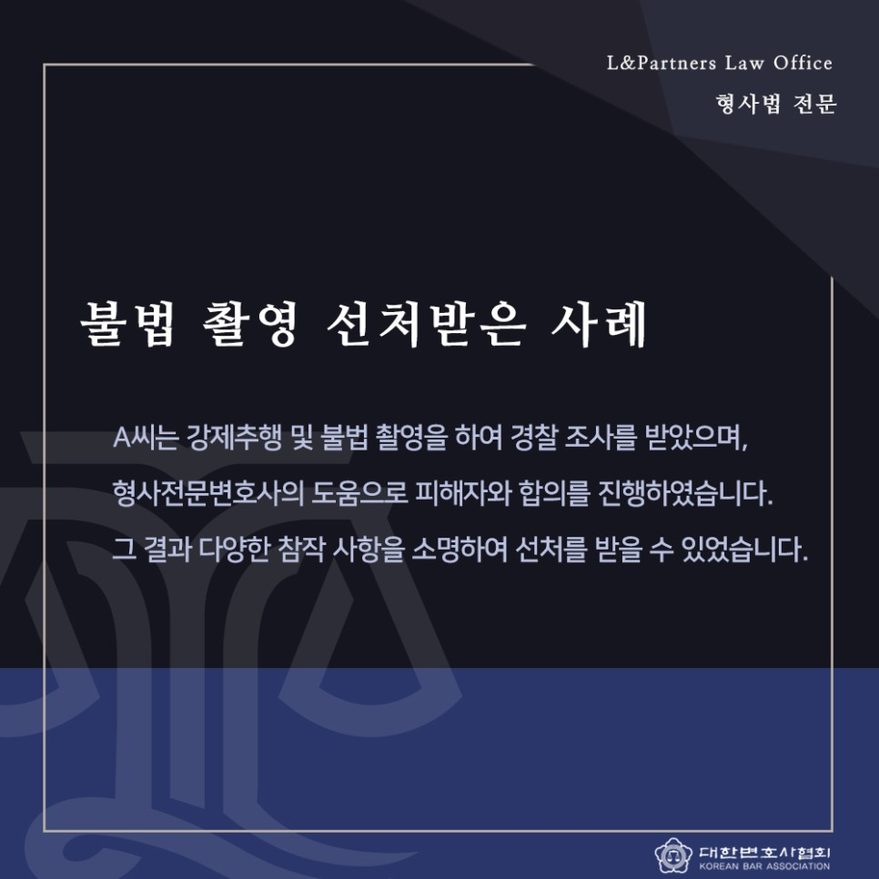 다음으로 화장실 불법촬영물에 대한 합의를 도우며 성공적으로 합의를 마무리한 저희 법무법인의 사례를 살펴보겠습니다. 박씨는 친구들과 술을 마신 뒤 노래방에서 여가 시간을 보냈다. 노래방에서 맥주를 마시던 그는 화장실에 가려고 일어났다. 이번에 방문한 노래방은 제가 자주 가는 곳이 아니어서 그곳의 화장실 구조를 잘 알지 못했습니다. 박씨는 남녀공용 화장실에서 소변을 보는 동안 여자화장실의 움직임을 감지했다. 그 순간 그는 성적 충동을 통제하지 못하고 휴대전화로 피해자 몰래 사진을 찍기 시작했다. 피해자는 만취상태였던 그와 달리 정상적인 상태였는데, 뭔가 이상함을 느끼고 주위를 둘러보다가 그를 발견하고 큰 소리로 비명을 질렀다.