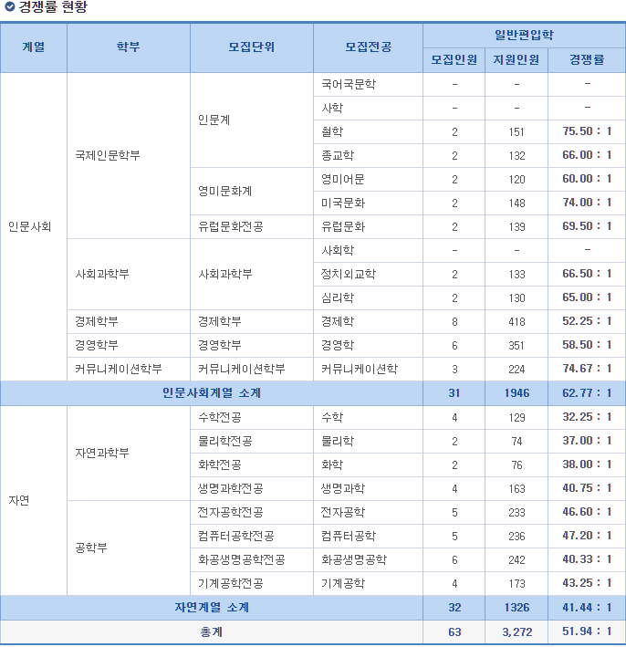 (참치특집칼럼) “편입수학 무 베이스 공부로 이공계 합격 비법” 무베이스라고 말하지만 실제로는 기본이 있는 경우가 많습니다. 기본적인 4가지 동작만 아는 노베이스도 준비는 가능합니다… blog.naver.com 안녕하세요. 참치 이송! 오늘 포스팅에서는 2024학년도 서강대학교 편입 경쟁률에 대해 집중적으로 살펴보겠습니다. 누구에게나 자신만의 선택하는 학교가 있지만, 많은 학생들이 꿈의 학교로 목표로 삼는 학교는 서강대학교입니다. 대부분의 사람들은 아마도 자신이 다니는 대학의 이름 가치를 높이려는 열망으로 편입을 시작할 것입니다. 그런 점에서 서강대학교는 비교할 수 없는 만족감과 성취감을 주는 학교입니다. 이제부터 Tuna와 함께 2024학년도 경쟁률을 꼼꼼히 살펴보시고, 다가오는 2025학년도 편입을 더욱 전략적으로 준비하시기 바랍니다! 2024년 서강대학교 편입 지원자격 먼저, 서강대학교 선발과정별 지원자격을 간략하게 살펴보겠습니다. 일반전형의 경우 지원자는 국내외 4년제 대학에서 2년 이상을 수료하였거나 수료 예정인 자로서, 일정 학점을 취득하여야 지원 가능합니다. 65학점 이상 취득하시면 지원 가능합니다. 취득학점이 65학점 미만인 경우, 출신대학 졸업에 필요한 총학점의 1/2 이상을 취득한 경우 지원 가능합니다. 정규대학을 졸업했거나 졸업예정인 사람도 이와 동등한 학력을 가진 것으로 인정되며, 학점은행제나 자율학습으로 학위를 취득한 경우에도 문제 없이 지원 가능합니다. 학사 전형을 위해서는 지원자격에 따라 국내외 4년제 대학을 졸업하였거나 졸업예정인 자이어야 합니다. 다른 법령에 따라 이와 동등한 학력이 있다고 판단되는 경우에도 지원 가능합니다. 일반전형 절차부터 시작해서 서강대학교 편입을 위한 일반전형 경쟁률을 살펴보겠습니다. 일반전형에는 총 79명의 지원자 중 4,217명이 지원해 총 53.38:1의 비율을 기록했다. 먼저 인문계열과 자연계열에서는 3,073명이 모여 45명을 모집해 68.29:1의 비율을 기록했다. 이 중 경쟁률이 가장 높은 학과는 사학과였다. 209명이 모여 2명을 모집해 무려 104.50:1의 비율을 기록했다. 이어 유럽문화전공 역시 2명 모집에 200명이 몰리는 등 100:1의 경쟁률을 보였다. 경쟁률이 가장 낮은 곳은 경제경영학과 경제경영학부였다. 420명과 634명이 모여 각각 8명과 12명을 모집해 52.50:1과 52:83:1을 기록했다. 다른 학과에 비하면 상대적으로 낮은 편이지만, 다른 학교에 비하면 전체적으로 경쟁률이 매우 높은 학교라고 볼 수 있습니다. 일반 입학과 자연과학 분야의 경쟁률도 그만큼 높습니다. 총 1,144명이 모여 34명을 모집했는데, 비율은 33.65:1이었다. 이 중 경쟁률이 가장 높은 학과는 컴퓨터공학과로 97명이 2명을 모집해 48.50:1의 경쟁률을 보였다. 반면, 가장 낮은 순위는 기계공학과로 5명에 지원자가 147명으로 비율이 29.40:1에 불과했다. 하지만 보시다시피 다른 모든 학과의 평균 경쟁률이 높아서 좋은 자리를 찾기가 어렵습니다. 학부 입학 경쟁률 서강대학교 편입 경쟁률 학부 입학전형을 보면 일반전형과 마찬가지로 학생도 인문계열, 인문계열, 자연계열로 나누어져 있습니다. 총 31명이 모집되었으며, 지원자는 975명으로 31.45:1의 비율을 기록하였습니다. 학부 입학전형의 경쟁률은 다른 학교에 비해 10~20:1로 상당히 높은 편이다. 인문계열은 19개 직위에 706명이 지원했고, 합격률은 37.16:1이었다. 전체 경쟁률은 비슷했지만 경쟁률이 가장 높았던 학과는 종교학전공으로 2개 자리에 97명이 재학했다. 가장 낮은 것은 경영학과로 3명에 80명이 지원해 26.67:1의 비율에 그쳤다. 자연과학 분야에서는 269명이 모여 12명을 모집해 22.42:1의 결과를 기록했다. 생명과학전공은 56명이 지원해 2명에 28.00:1로 경쟁률이 가장 높았고, 수학과 전자공학전공은 2명에 36명이 지원해 18.00:1로 경쟁률이 가장 낮았다. 지금까지 2024학년도 서강대학교 편입 경쟁률을 살펴보았습니다. 전체적으로 다른 학교에 비해 지원자가 훨씬 많고, 경쟁률도 치열한 것을 확인할 수 있었습니다. 서강대학교를 목표로 준비하는 분들은 더욱 철저한 준비가 필요한 필기과목과 지원자격을 갖추고 지원하셔서 꼭 원하는 결과 얻으시길 바랍니다!